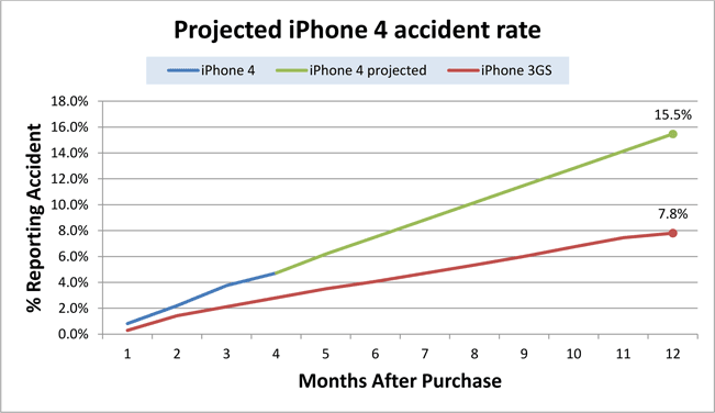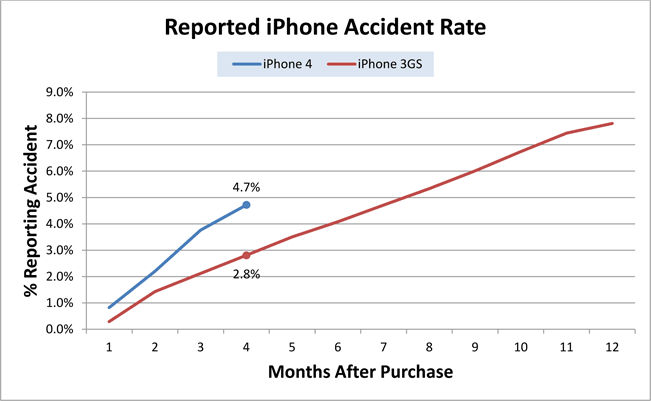 Ekipa iz SquareTrade je napravila analizu iPhone nesreća i oštećenih uređaja na preko 20 tisuća uzoraka gdje je statistika pokazala da je 82% veći problem oštećenih ekrana nego na iPhone 3GS.